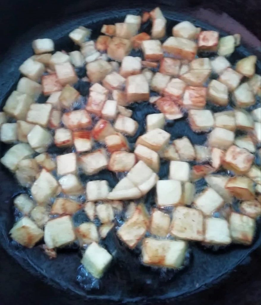 Beginnen Sie mit dem Frittieren der Auberginen, wenn sie leicht goldbraun sind, schöpfen Sie sie ab und legen Sie sie beiseite.