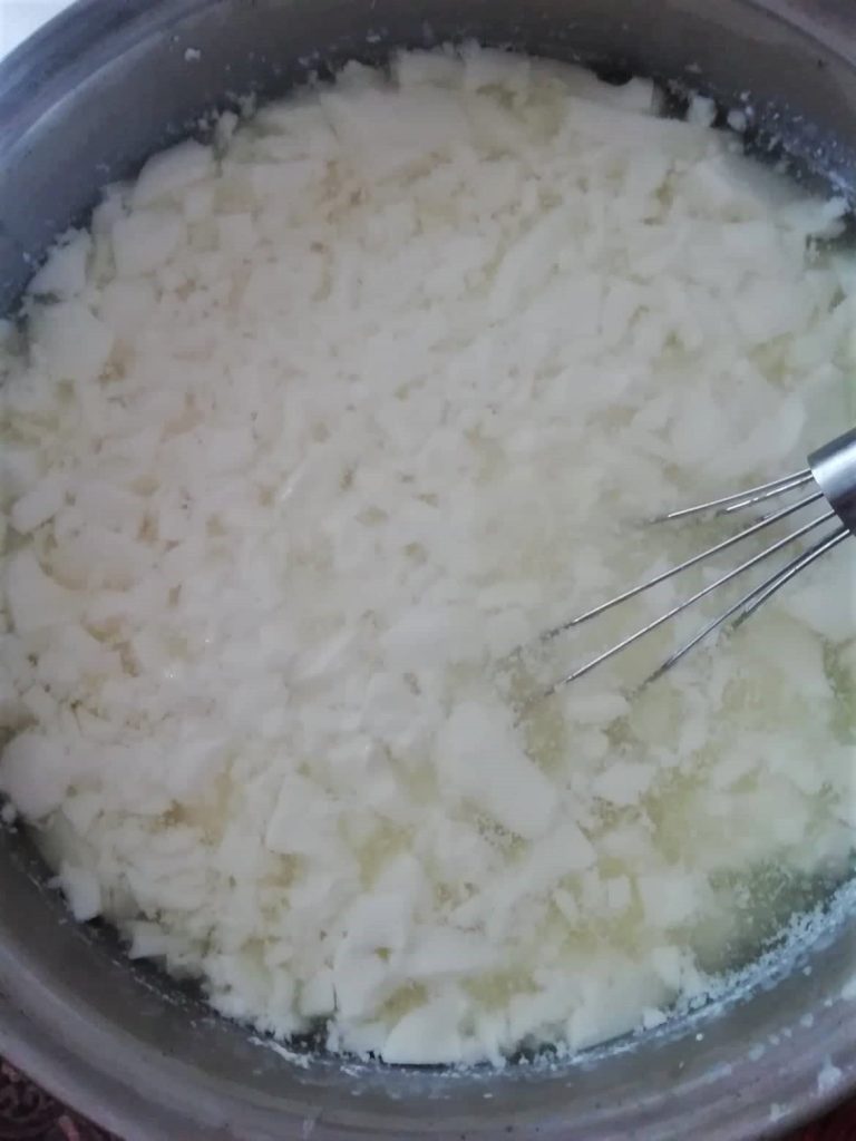 Nach 40 Minuten ist die Magie des Käses vollbracht. Der Käsebruch ist fertig und Sie werden im Topf eine puddingartige Masse sehen, die leicht in die Molke (gelbliche Flüssigkeit) absinkt.