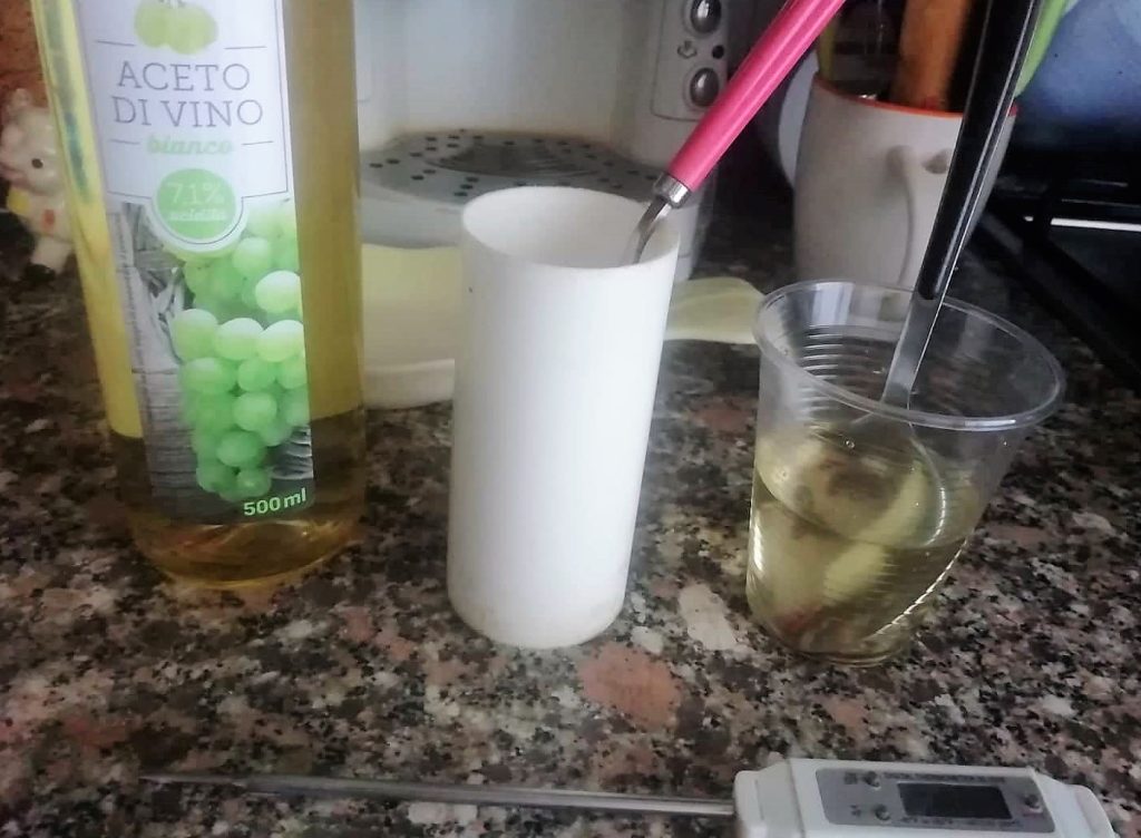 Wenn die Temperatur 70 Grad erreicht, gebt weitere 3 Esslöffel Essig dazu, rührt mit dem Kochlöffel und nehmt den Topf vom Herd. Wartet noch 2 Minuten, bevor ihr den restlichen Essig und das Salz dazugebt. Rührt alles ein letztes Mal und hört dann auf.