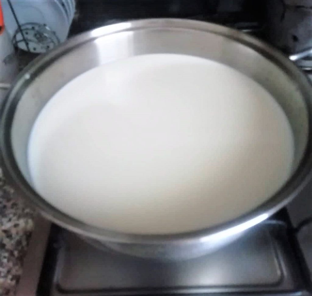 Stellt den Topf mit der Milch auf den Herd bei niedriger Hitze und erwärmt sie, bis sie etwa 50 Grad erreicht (prüft mit dem Thermometer).