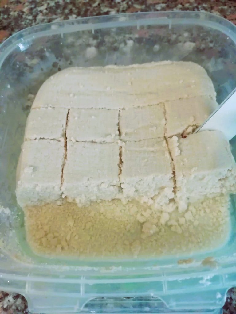 Lassen Sie die Flüssigkeit abtropfen, in der der Tofu aufbewahrt wird, lassen Sie ihn ruhen, bis er Raumtemperatur erreicht, wenn er kalt war, dann schneiden Sie ihn in etwa zwei Zentimeter große Würfel (auf dem Foto mein halb fester hausgemachter Tofu). Dann tupfen Sie die Tofuwürfel leicht mit saugfähigem Küchenpapier ab.