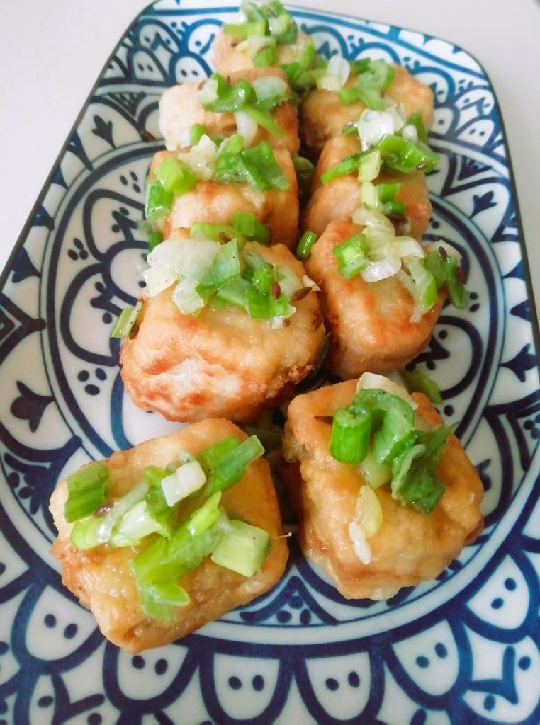 Legen Sie die frittierten Tofuwürfel auf einen Servierteller und bestreuen Sie sie vor dem Servieren mit dem zuvor zubereiteten Schnittlauchöl.