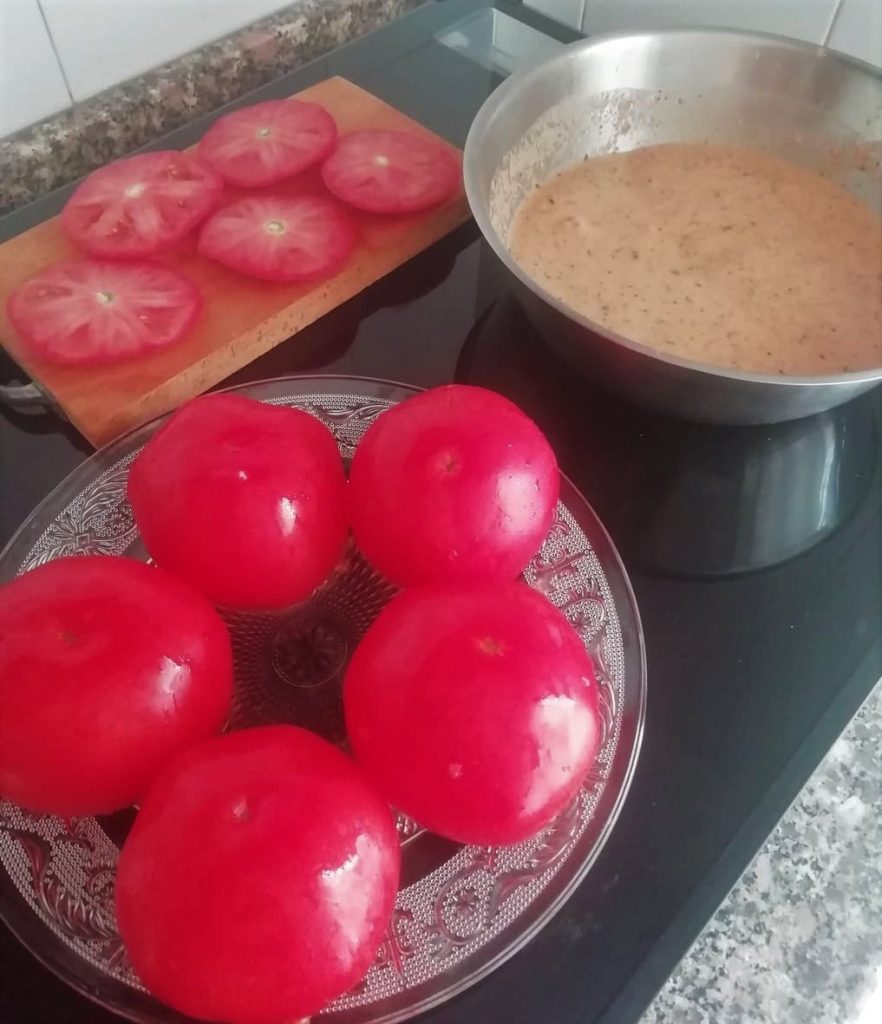 Ist die Marinade fertig, füllen Sie die Tomaten mit etwa 2 Esslöffeln Reisfüllung, ohne über den Rand zu füllen, und bleiben Sie ein paar Millimeter darunter. Verschließen Sie die Tomate mit dem Deckel, den Sie beiseitegelegt haben, und legen Sie sie in die Auflaufform.
