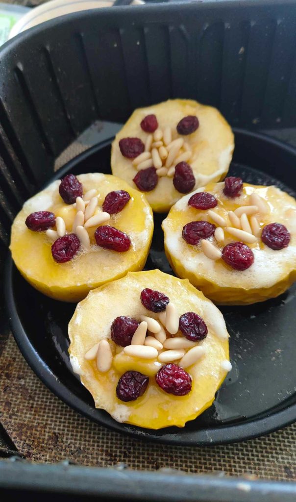 Legen Sie die Äpfel wieder in die Heißluftfritteuse und garen Sie sie weitere 10 Minuten bei 180° weiter.