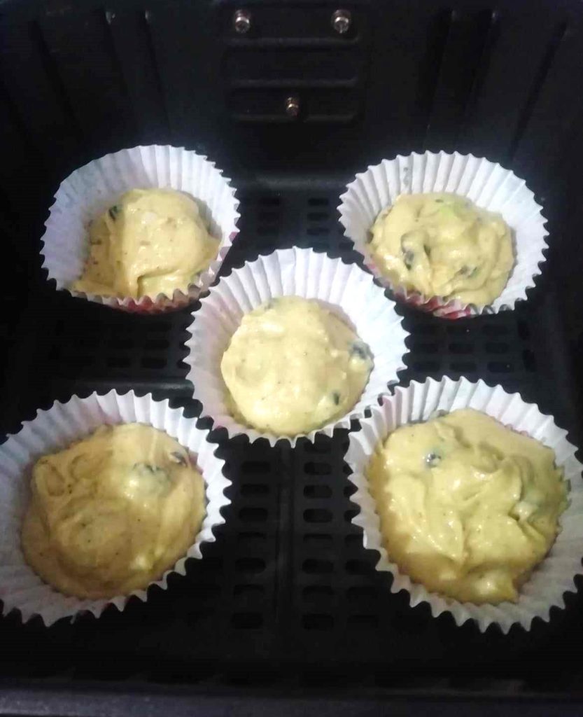 Backen Sie die Muffins mit Oliven in der Heißluftfritteuse bei 160°C für 15 Minuten. Gleiche Temperatur und Zeit für den traditionellen Ofen.