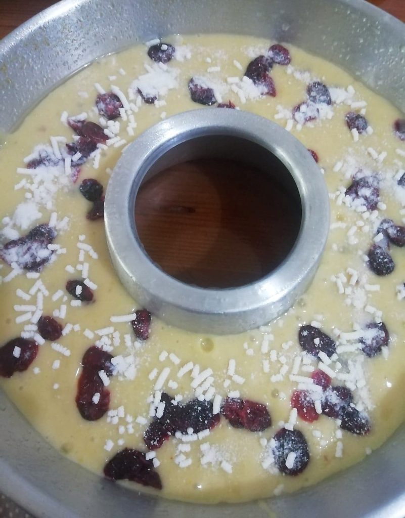 Streuen Sie auf die Oberfläche des Gugelhupfs die getrockneten Cranberries und ein paar Esslöffel Hagelzucker.