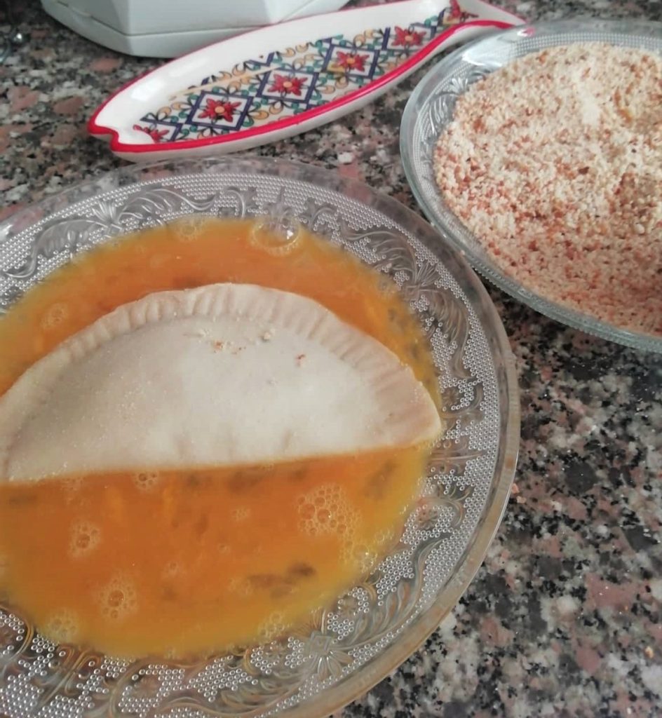 Nacheinander tauchen Sie die Halbmonde zuerst in das geschlagene Ei und dann in die Semmelbrösel.