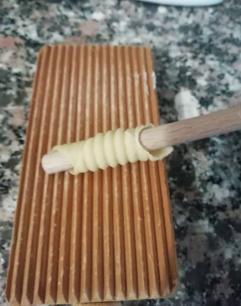 Um die Form der Garganelli zu erhalten, genügt es, die Rombe aus Eierteig um einen speziellen Holzstab zu rollen und sie dann auf einem kleinen gerillten Brett, genannt Kamm oder Gnocchi-Rolle, zu drehen, um der Pasta die charakteristische Riffelung zu verleihen.