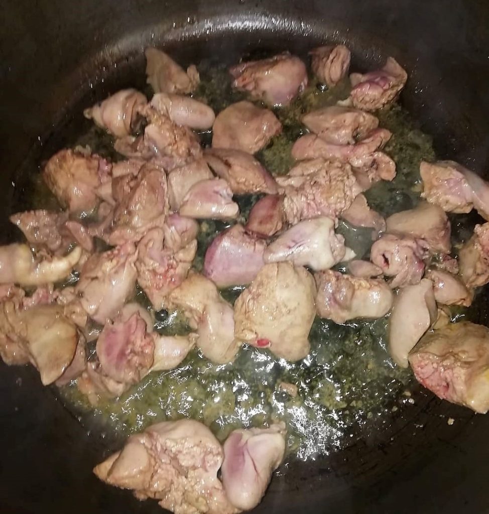 Geben Sie das Öl in eine Pfanne und wenn es heiß ist, fügen Sie die Lebern hinzu und braten Sie sie bei starker Hitze 5 Minuten lang an.