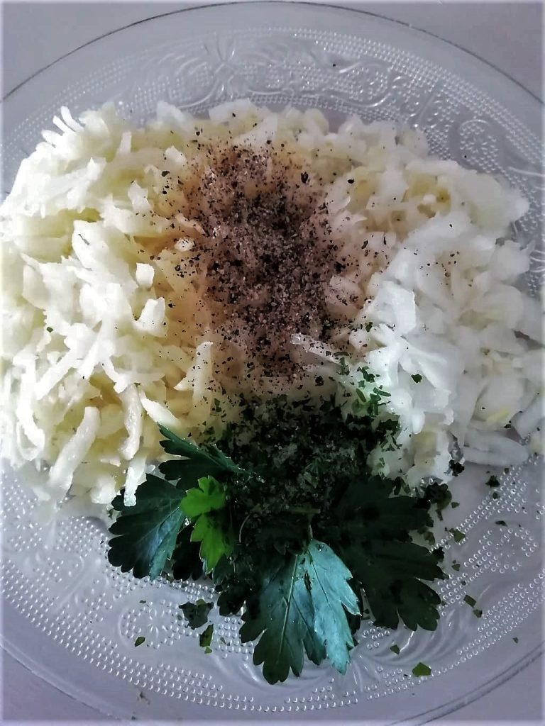Mit einer groben Reibe die Kartoffel bzw. die Kartoffeln reiben — es werden etwa 200 Gramm benötigt — und auch die Zwiebel reiben. Dann die frische Petersilie hacken und den schwarzen Pfeffer mahlen.