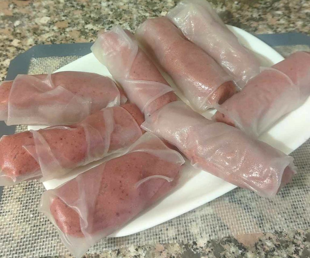 Reispapierblätter sind leicht im Supermarkt zu finden, in den Abteilungen für asiatische Lebensmittel. Sie rehydrieren in wenigen Minuten im Wasser und sind bereit, mit der Füllung umwickelt zu werden. Vorgekochte Kichererbsen und Rote Beete beschleunigen die Zubereitung. Einzige Kochzeit ist das Anbraten der Pilze in der Pfanne für ein paar Minuten, bevor sie der Füllung für die Rollen hinzugefügt werden.