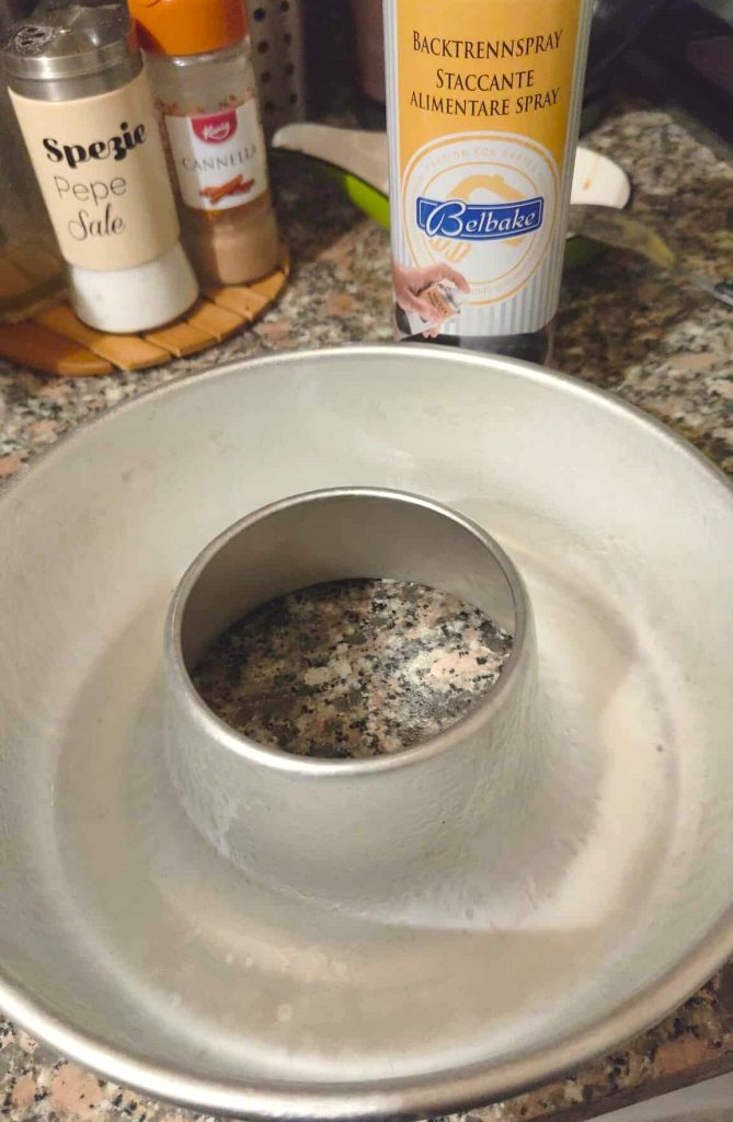 In der Zwischenzeit das Trennspray in die Form sprühen (ich verwende das von Lidl), oder eine Schicht Butter auftragen und dann mit einer dünnen Schicht Mehl bestäuben.