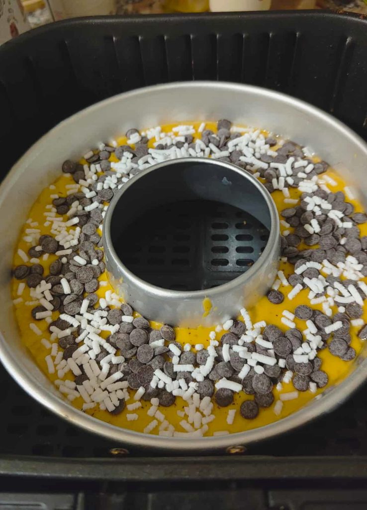 • Nehmen Sie eine Gugelhupfform mit einem Durchmesser von 20 cm. Fetten Sie sie ein und bestäuben Sie sie mit Mehl oder sprühen Sie Trennmittel. Gießen Sie den Kuchenteig hinein und glätten Sie ihn, klopfen Sie leicht auf die Arbeitsplatte, um eventuelle Luftblasen zu entfernen, und bestreuen Sie die Oberfläche mit Zartbitterschokoladenstückchen und Zuckerstreuseln.