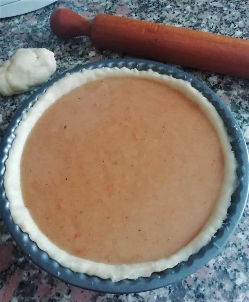 • Bereiten Sie den Mürbeteig vor, indem Sie in einer Schüssel das Mehl, die Butter oder die pflanzliche Margarine bei Raumtemperatur, die Prise Salz, den Zucker und das Vanillearoma vermengen. Kneten Sie, bis der Teig krümelig wird, dann fügen Sie nach und nach das Wasser mit einem Löffel hinzu und kneten Sie weiter.