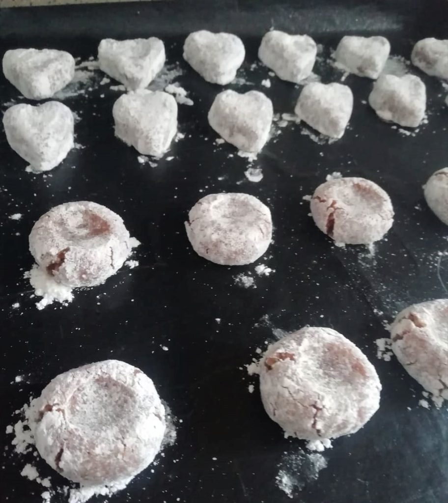 Rollen Sie die Kugeln oder Herzen in der Puderzuckermischung von beiden Seiten.
