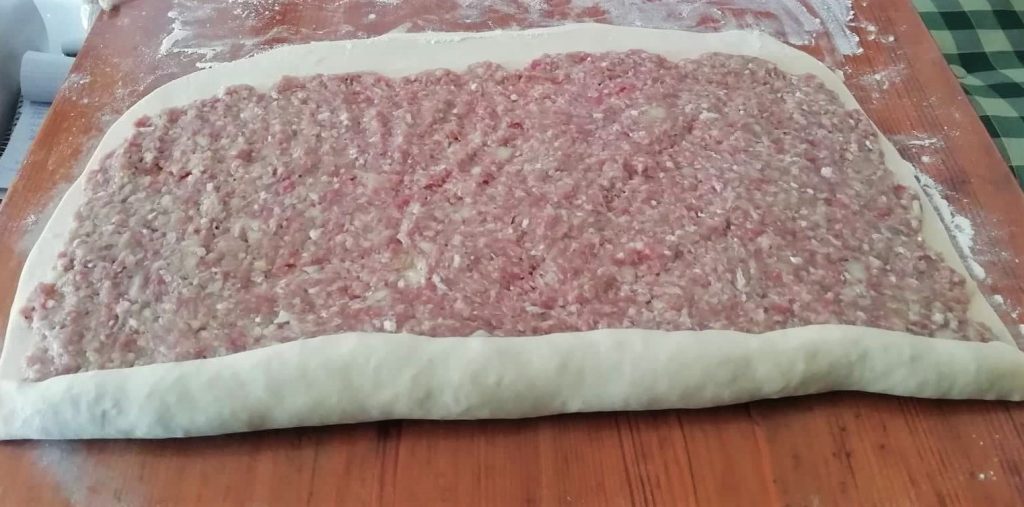 Verteilen Sie die Fleischmasse gleichmäßig darauf, lassen Sie dabei an einer Seite einen kleinen Rand von 2 Zentimetern frei.
