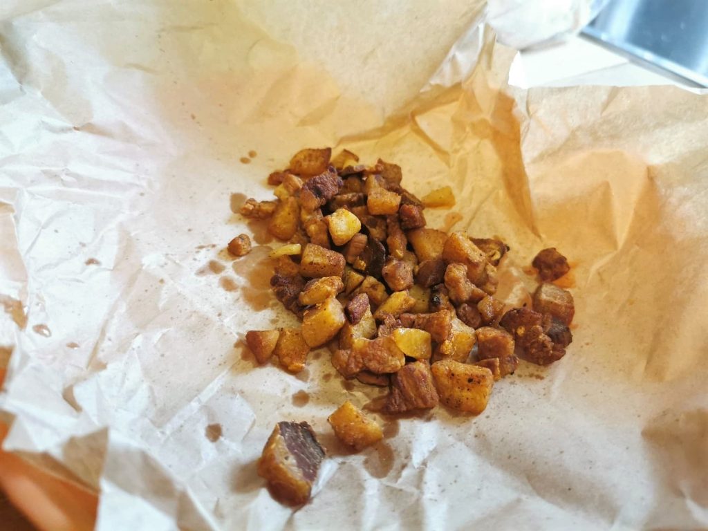 Das Geheimnis des Küchenchefs: Nehmt den Guanciale mit einer Schaumlöffel heraus und legt ihn auf ein Blatt Backpapier oder auf das Papier, das der Metzger zum Einwickeln der Wurstwaren benutzt. Wickelt den Guanciale in das Papier. Dieser kleine Trick macht den Guanciale knusprig und genau richtig.