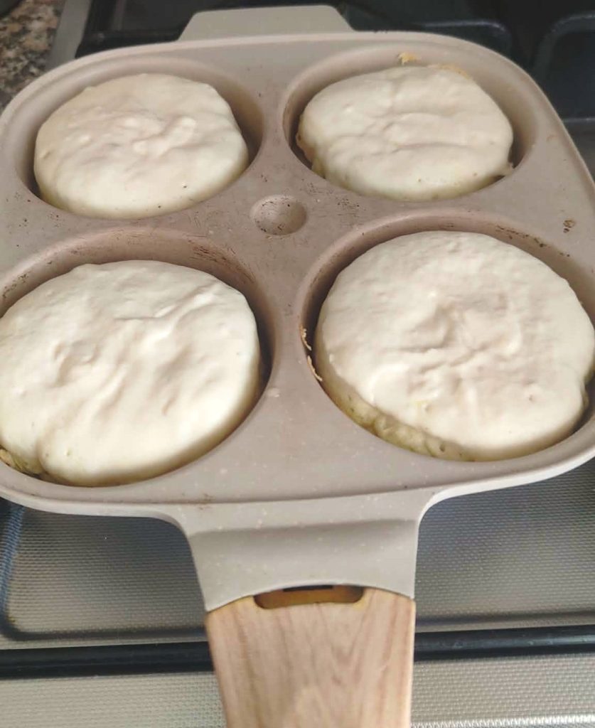 Brate die Brötchen, bis sie goldbraun und schön aufgegangen sind (ca. 2–3 Minuten), dann wende sie und beende das Garen.
