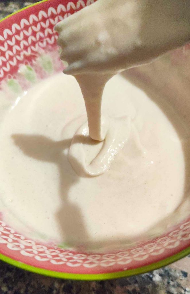 Vermengen Sie die Mischung mit einer Gabel bis sie glatt und homogen ist, wie ein flüssiger Teig (siehe Foto unten).