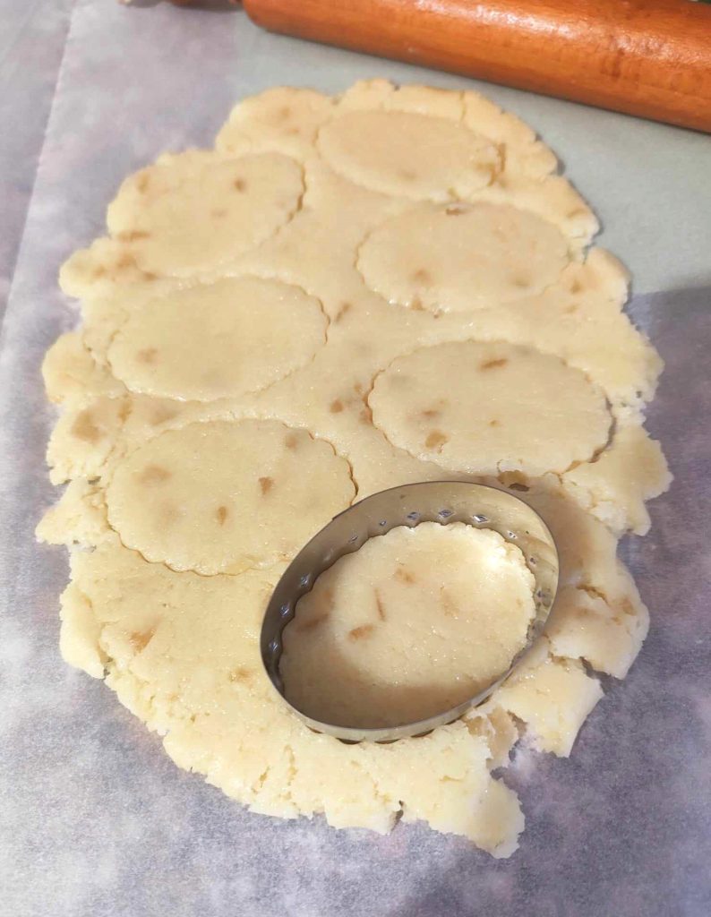 Nach der Ruhezeit nehmen Sie einen Teil des Teigs und legen ihn zwischen zwei Backpapierbögen und rollen ihn mit dem Nudelholz auf die gewünschte Dicke aus, dann schneiden Sie die Reiskekse mit einer Form aus.