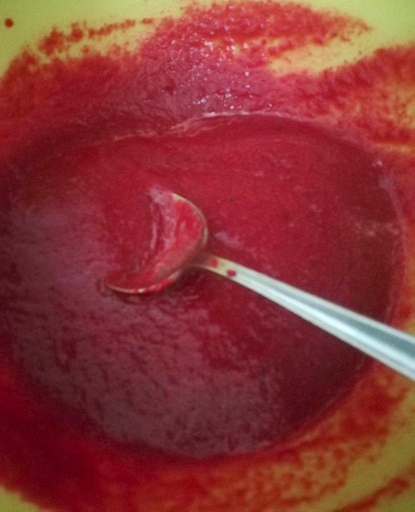 1 – Pürieren Sie die vorgekochte rote Bete fein mit dem Wasser, bis sie eine glatte Masse bildet. Dann geben Sie sie in eine Schüssel und fügen den Zucker und die zerbröselte Hefe hinzu.