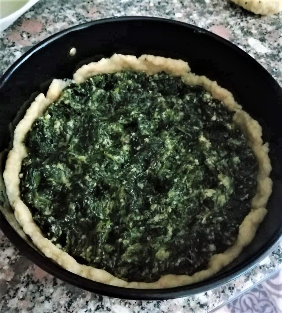 Gebt den Spinat in eine Schüssel zusammen mit dem Parmesan und dem verquirlten Ei. Probiert die Masse und fügt bei Bedarf noch etwas Salz und eine Prise frisch gemahlenen schwarzen Pfeffer hinzu. Vermischt die Spinatmasse und gebt sie dann gleichmäßig in die Form.
