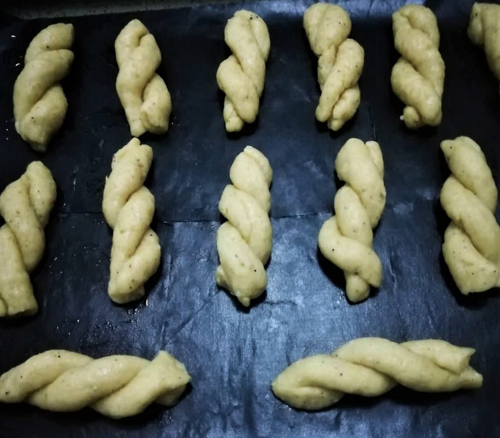 Legen Sie die fertigen salzigen Zöpfchen Käse und Pfeffer in eine Backform.