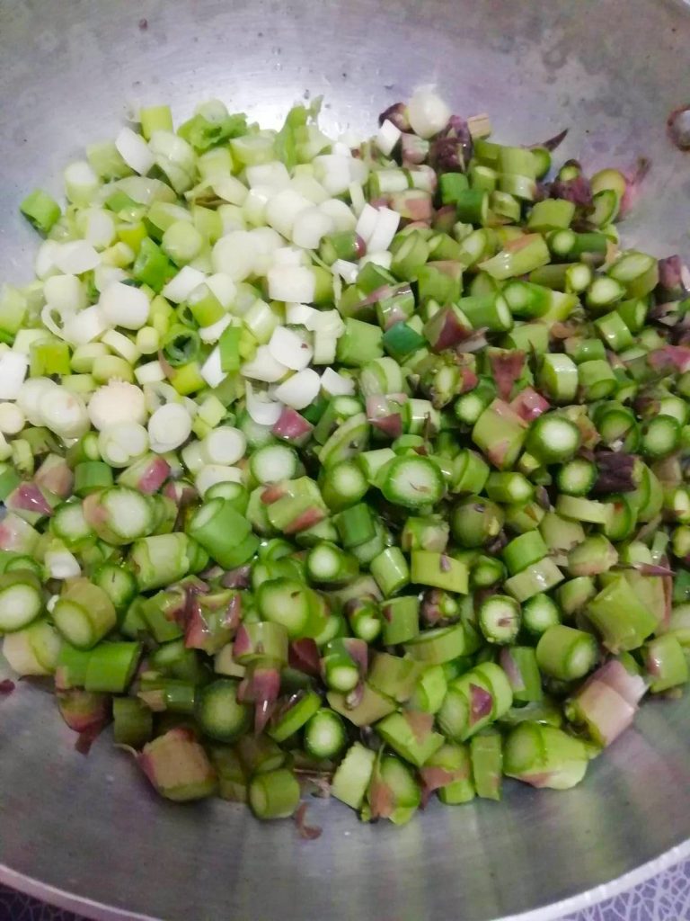 In der Zwischenzeit reinigen Sie die Spargel, schneiden die Spitzen in dünne Scheiben bis zum weichsten Teil, stoppen Sie am härtesten Teil. Schneiden Sie auch die Frühlingszwiebel in dünne Scheiben und geben Sie das Gemüse in die Pfanne mit einem Schuss Olivenöl.