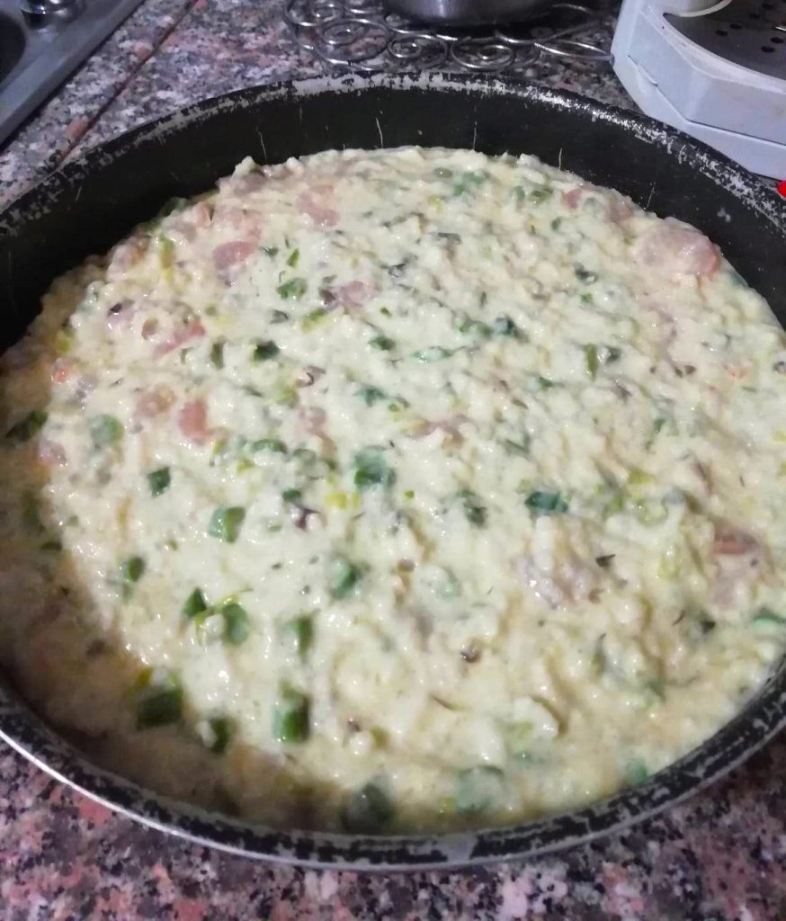 Nachdem Sie den Reis püriert haben, fügen Sie die in der Pfanne gebratenen Spargel, die Garnelen, die Instanthefe für herzhafte Torten, Salz und gemahlenen weißen Pfeffer hinzu.