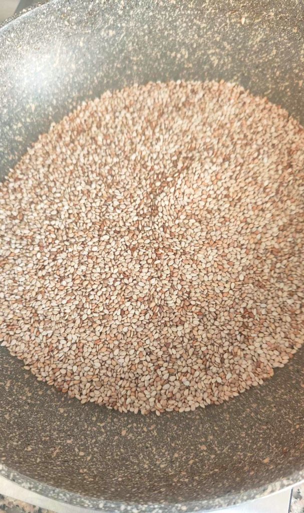 • Wenn Sie stattdessen ungeröstete Sesamsamen verwenden, ist die Prozedur, sie vor dem Mahlen zu rösten.