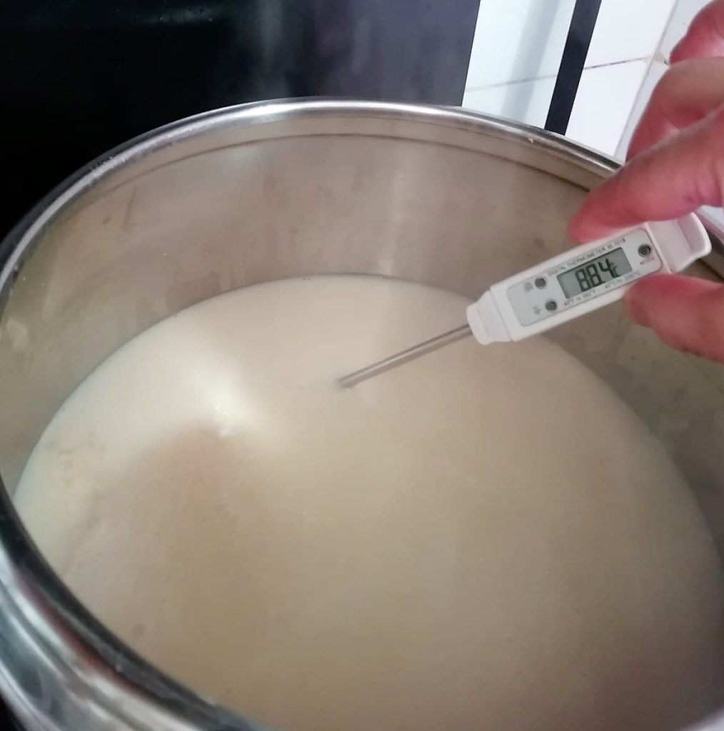 Wenn ihr kein Lebensmittelthermometer habt, erkennt ihr die richtige Temperatur daran, dass sich am Rand des Topfes ein Ring kleiner Bläschen bildet, die kurz vor dem Aufkochen sind.