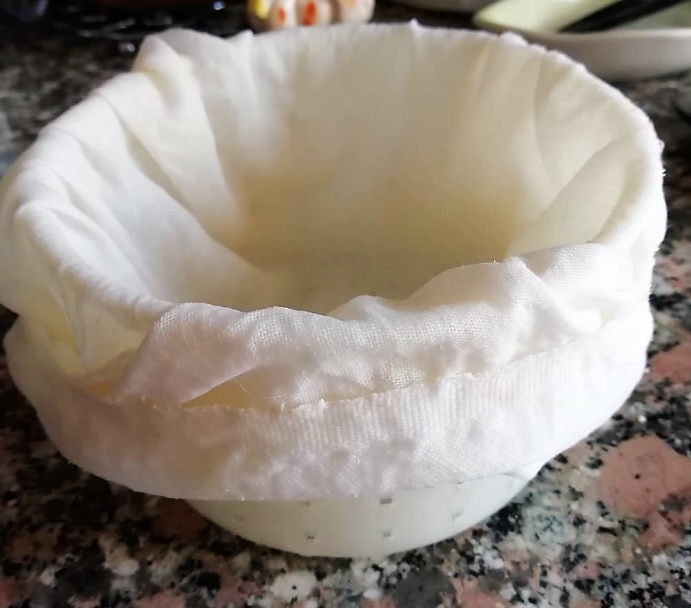 In der Zwischenzeit bereitet ihr eine geperforte Form vor, die mit einem leicht feuchten Baumwolltuch ausgelegt ist. Mit einer gelochten Kelle nehmt ihr die Sojakäseflocken vorsichtig heraus, damit die Bruchstücke der Gallerte nicht zerreißen, und legt alles in die Form auf das Tuch.