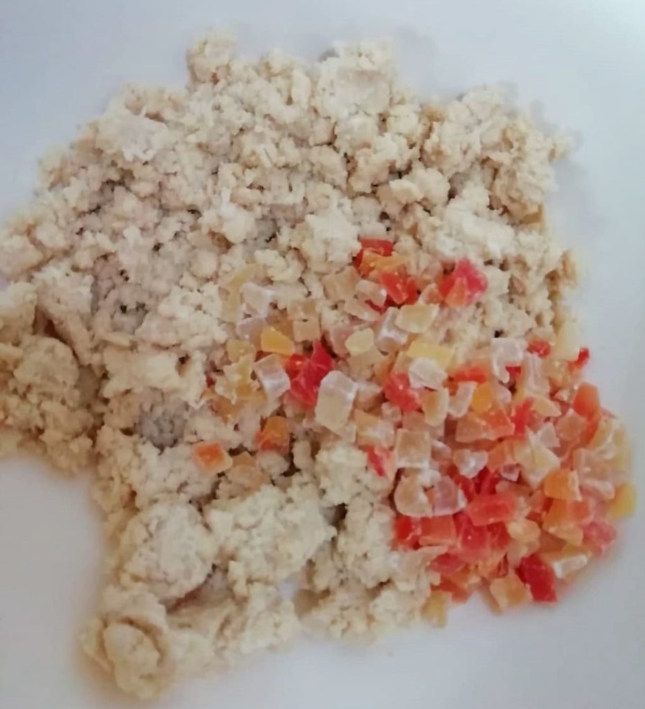 4 – Wenn der Teig eine krümelige Konsistenz hat, gebt das kandierte Obst dazu und knetet auf der Arbeitsfläche weiter, bis ein glatter und kompakter Teigling entsteht.