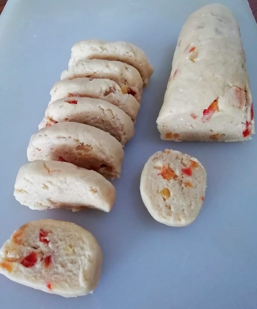 5 – Formt aus dem Teig eine zylindrische Rolle, ähnlich einer dicken Salami, und schneidet 16 Scheiben von jeweils etwa einem Zentimeter Dicke.