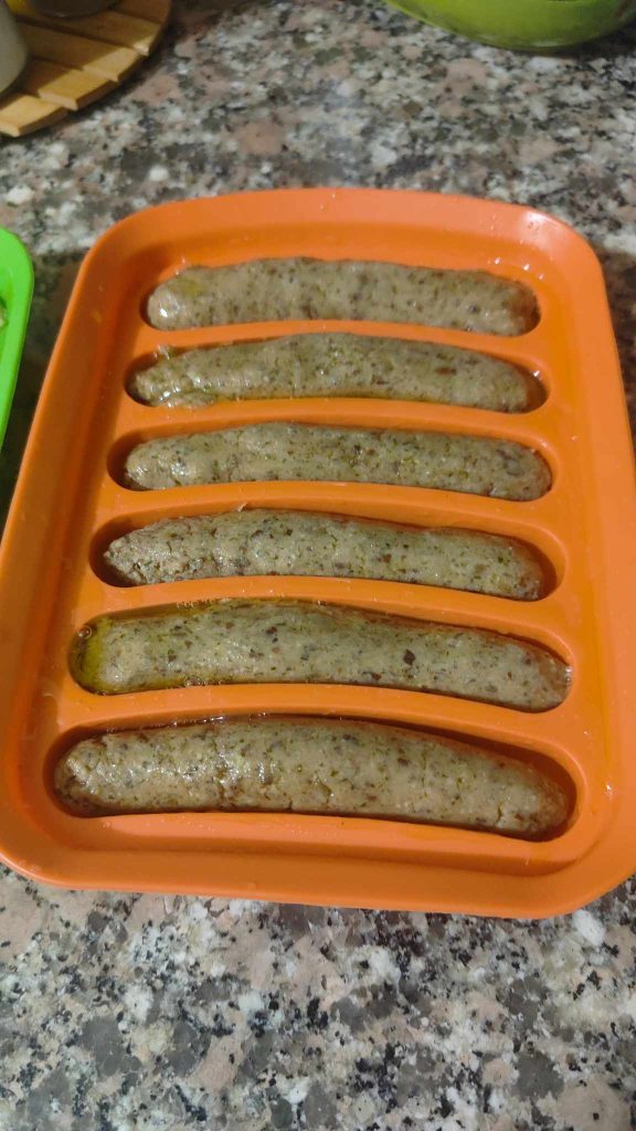 Nehmen Sie kleine Portionen der Masse und formen Sie mit den Händen Würstchen, und legen Sie sie einzeln in die Silikonform für Würstchen, die zuvor geölt wurde. Bestreichen Sie auch die Oberseite mit Öl. (alternativ können sie auch zu Hamburgern oder kleinen Frikadellen geformt werden)