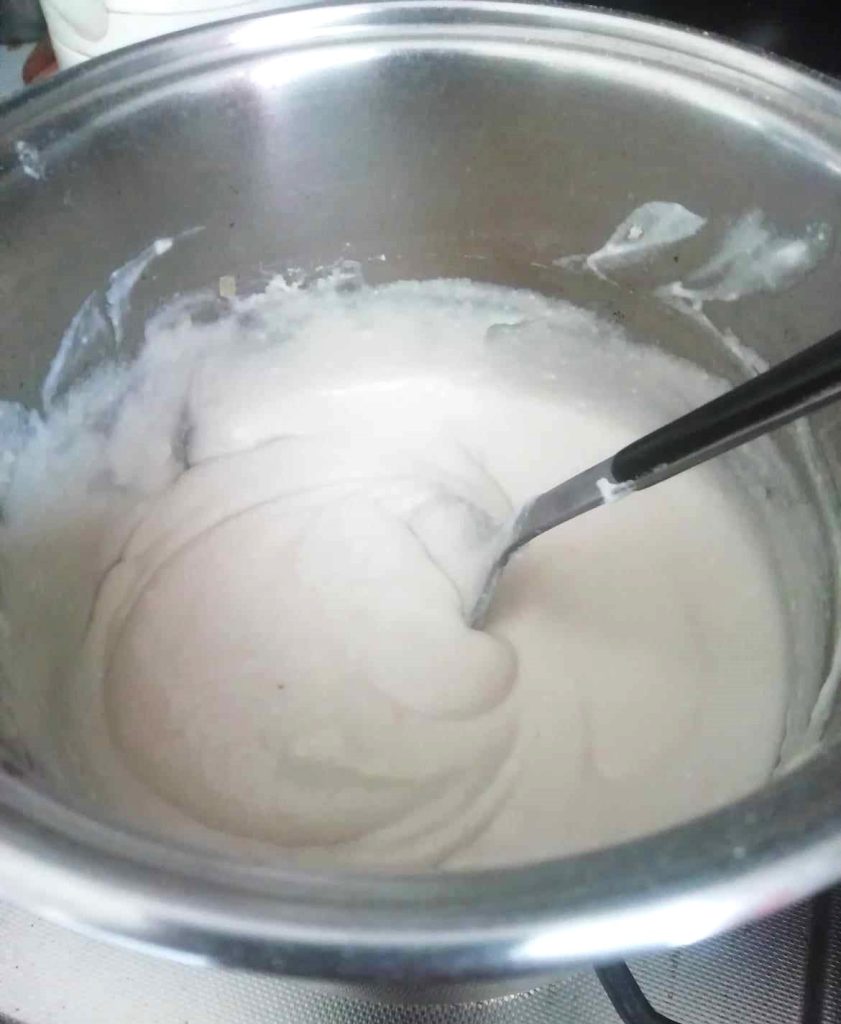 Gut umrühren und den Topf bei niedriger Flamme auf den Herd stellen. Die Mischung ständig rühren, bis sie zum Kochen kommt.