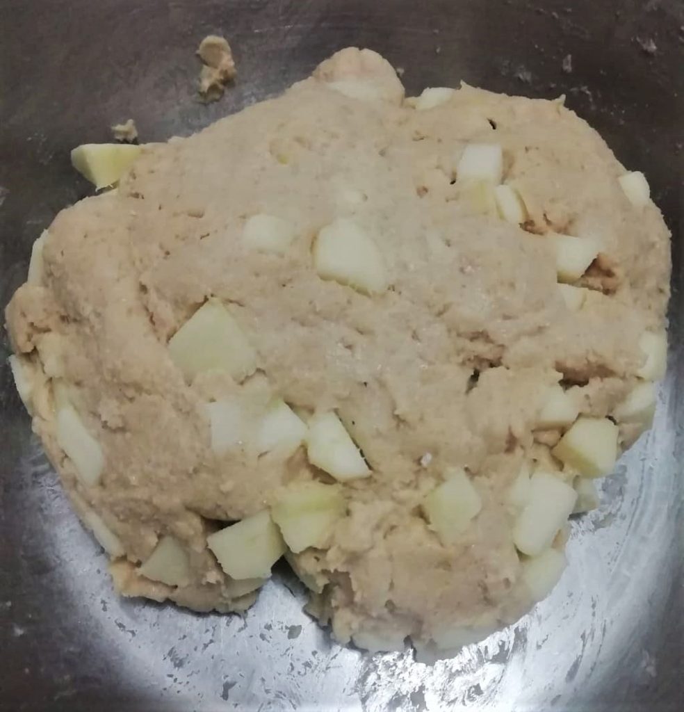 • In der Zwischenzeit geben Sie das gesiebte Weizen- und Hafermehl in eine Schüssel. Fügen Sie die geschlagenen Eier, den Honig, die weiche Butter, das Vanillin, das Salz und das Backpulver hinzu. Mischen Sie mit einem Spatel und fügen Sie dann die Äpfel hinzu. Vermengen Sie die Masse gut und verdichten Sie sie direkt in der Schüssel.