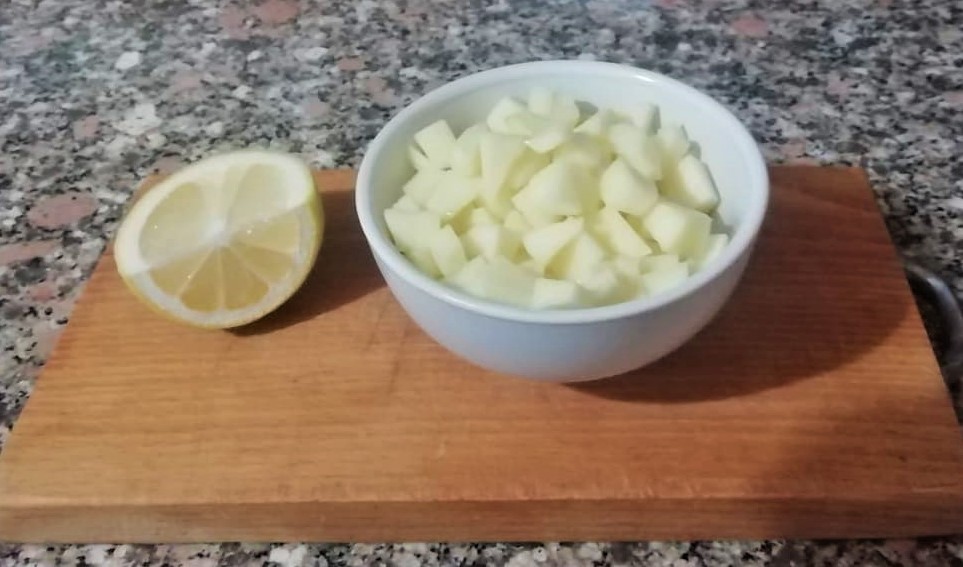 Pressen Sie den Saft der Zitrone aus und gießen Sie ihn über die Apfelwürfel, sodass sie einige Minuten marinieren.