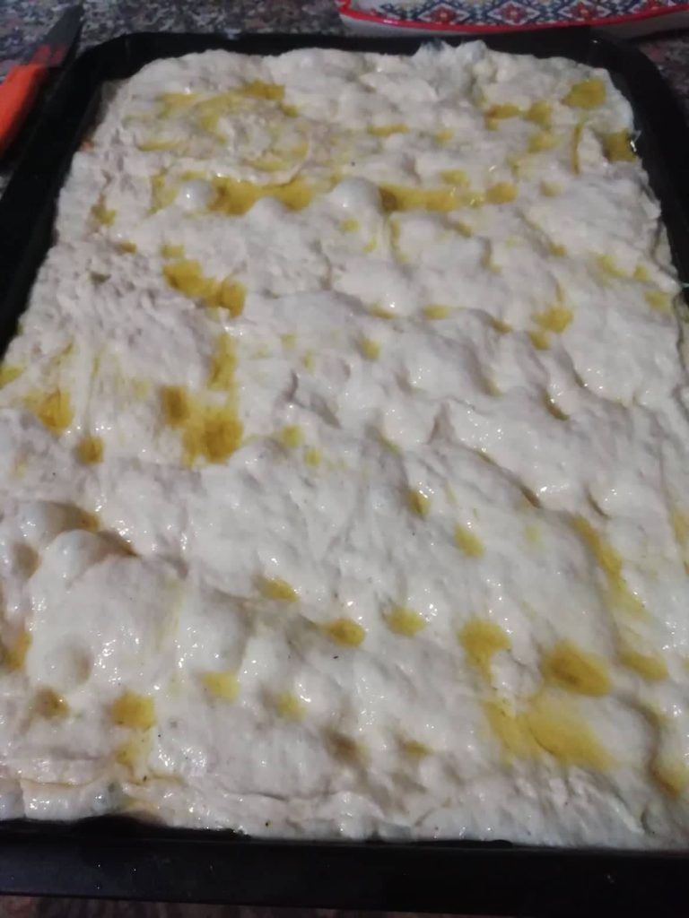 Verteilen Sie ihn so gut wie möglich bis zu den Rändern, decken Sie ihn ab und lassen Sie ihn im ausgeschalteten Ofen 1,5 Stunden aufgehen.
