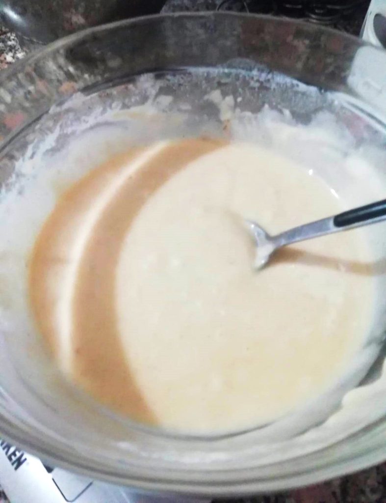Nehmen Sie eine weitere Schüssel, gießen Sie die Milch, das Öl, das Mehl, den Zucker, den Vanilleextrakt, eine Prise Zimt und das Backpulver hinein, das mit Vanille ist perfekt. Mischen Sie die Masse gut, sie sollte halbflüssig sein. Wenn nötig, fügen Sie 1 oder 2 Esslöffel Milch hinzu, um sie weicher zu machen.
