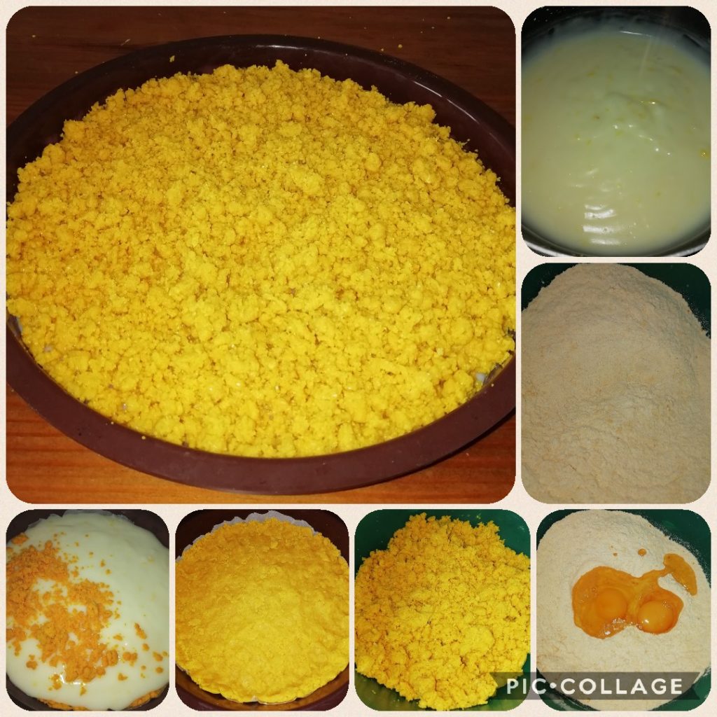 In der Zwischenzeit bereiten Sie den bröseligen Mürbeteig vor, indem Sie in einer Schüssel das gesiebte Mehl mit dem Zucker, dem Backpulver, dem Kurkuma-Pulver und der abgeriebenen Zitronenschale vermischen. Fügen Sie die ganzen Eier, die weiche Butter hinzu und kneten Sie die Mischung mit den Händen.