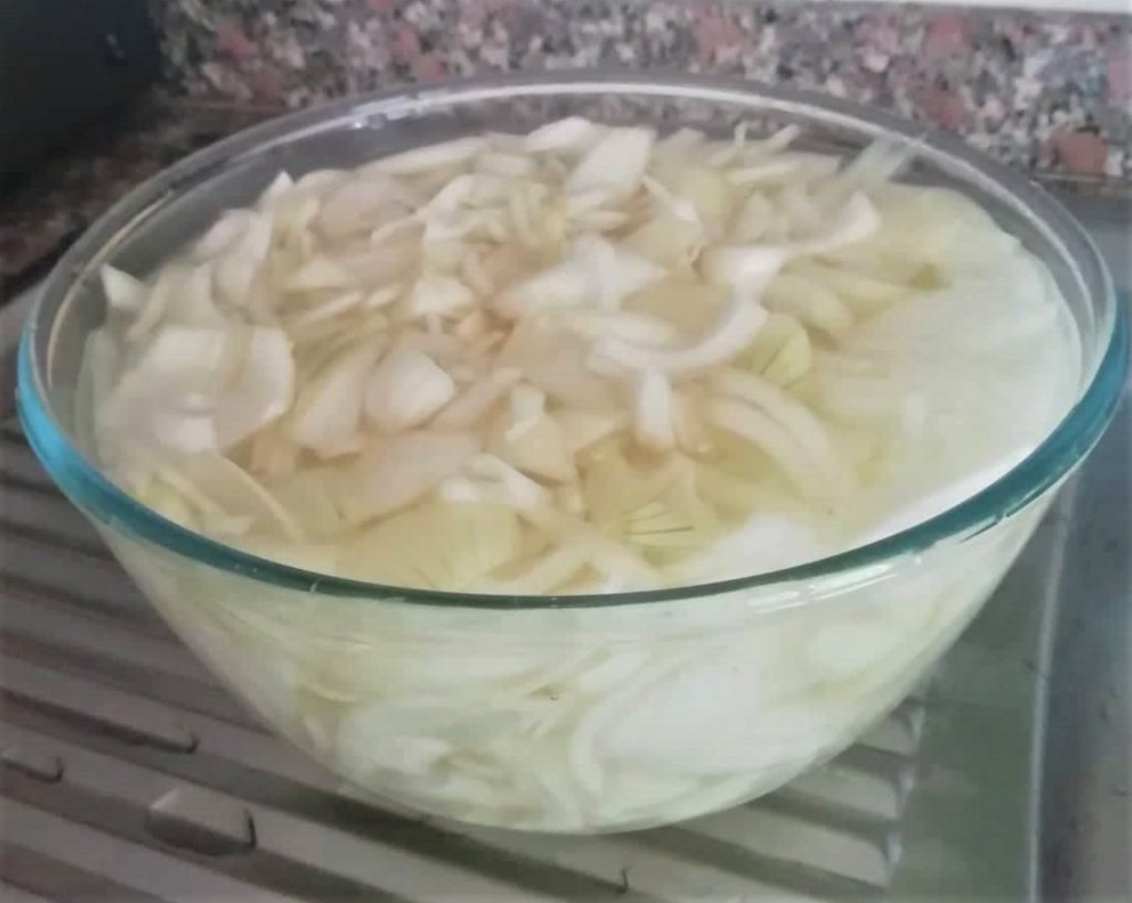 Um alle Zwiebeln zu schneiden, ohne zu weinen, empfehle ich, ein großes Becken mit Wasser vorzubereiten, die Zwiebel zuerst zu schälen und dann fein zu schneiden, indem Sie sie direkt ins Wasser tauchen.