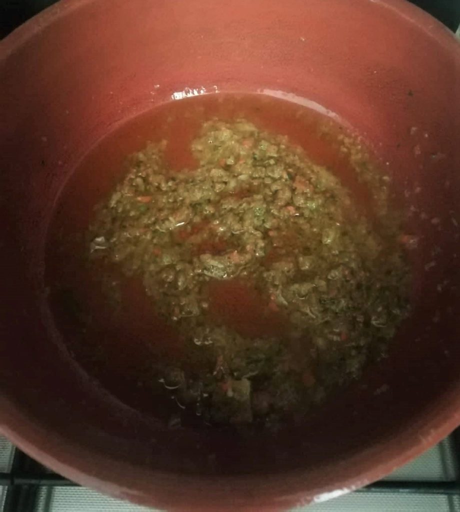 Geben Sie das Olivenöl auf den Boden und einige Esslöffel fertiges Sofritto im Glas oder eine Mischung aus Gemüse und lassen Sie es für ein paar Minuten anbraten.