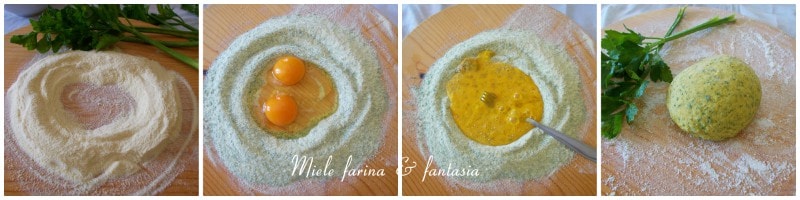 Dann mischen Sie sowohl den Grieß als auch das aromatisierte Weizenmehl Typ 00, geben Sie die Mischung auf eine Arbeitsfläche, machen Sie eine Mulde in der Mitte und geben Sie die Eier hinein.