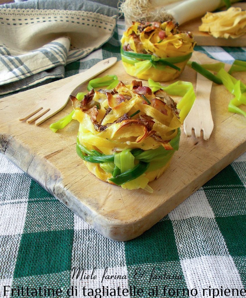 Ein zusätzlicher Tipp: Zum Dekorieren unserer verlockenden Tagliatelle-Frittatine können wir die Blätter (die inneren und zarteren) eines Lauchs verwenden. Wasser erhitzen, dann die Lauchblätter hinzufügen und einige Sekunden blanchieren, bis sie sich leicht biegen lassen. Abtropfen lassen und sofort in kaltes Wasser legen. Trocknen und der Länge nach in Streifen schneiden, die um die Frittatine gewickelt werden und so einen schicken Teller kreieren.