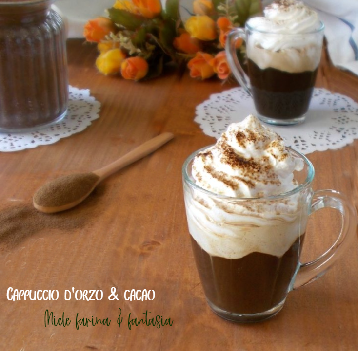 Wir erhitzen die Milch in einem kleinen Topf (wir können auch pflanzliche oder laktosefreie Milch verwenden); in der Zwischenzeit sieben wir das bittere Kakaopulver und fügen die lösliche Gerste in einen Krug; ich habe volle Teelöffel verwendet, da ich den Geschmack intensiv mag.