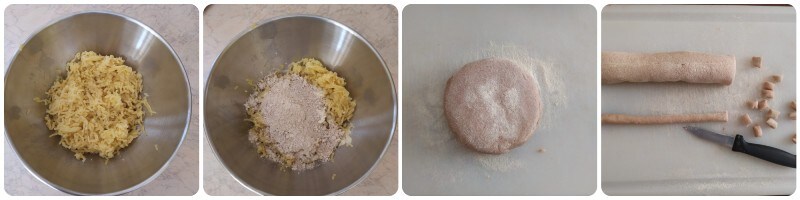 Nach der Zeit sieben wir in einer großen Schüssel den Hartweizengrieß und das Kastanienmehl zusammen, fügen die Hälfte des Kartoffelpürees, eine große Prise Salz hinzu und beginnen zu kneten. Nach und nach, wenn das Mehl aufgenommen wird, fügen wir weiteres Kartoffelpüree hinzu, bis eine feste, aber nicht harte, leicht zu bearbeitende Mischung entsteht.