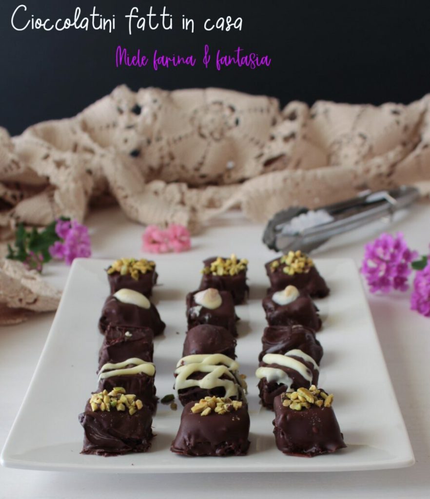 Nach einer Stunde nehmen wir unser rechteckiges Teigstück und legen es auf ein Schneidebrett. Schneiden wir es auf der kurzen Seite in fingerdicke Streifen; dann schneiden wir die Streifen auf der langen Seite nochmals, um kleine Würfel von Pralinen zu erhalten, die mit geschmolzener Schokolade überzogen und eventuell mit gehackten Nüssen (Mandeln, Haselnüsse, Walnüsse, Pistazien) verziert werden können.