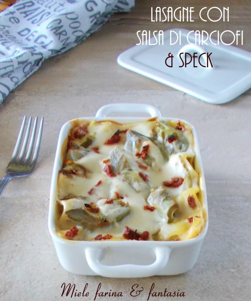 Die Lasagne mit Artischockensauce und Speck ist ein köstliches Hauptgericht, sehr schmackhaft, herzhaft und mit einer cremigen Sauce auf Artischockenbasis und knusprigem Speck zubereitet. Es ist ein Gericht, das man an Festtagen oder bei besonderen Anlässen zubereiten kann. Die Idee für die Sauce kam mir, als ich eine Folge von „Prova del cuoco“ sah, in der Sergio Barzetti sich genau an einer leichten Creme auf Artischocken- und Speckbasis versuchte.
