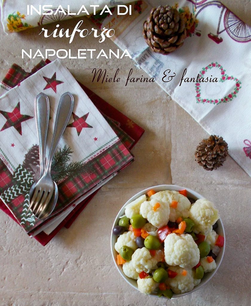 Der „Insalata di rinforzo“ auf neapolitanische Art ist ein sehr einfaches und leckeres Rezept, wirklich schmackhaft. Die Hauptzutat dieses Salats ist Blumenkohl, dem Oliven, eingelegte Gemüse, hausgemachte „Papaccelle“ (kleine süße Paprikaschoten in Essig) und gesalzene Sardellen hinzugefügt werden. Er wird zu Weihnachten und Silvester als Vorspeise beim Abendessen serviert, auf die dann weitere Vorspeisen folgen, in der Regel auf Fischbasis.